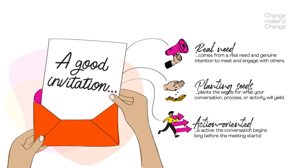 To help you better understand the key principles to create powerful invitations, we’d like to refer to this accessible blog post “A Little Secret to Participatory Leadership: The Art of Invitation” by Samantha Slade of the Going Horizontal movement.