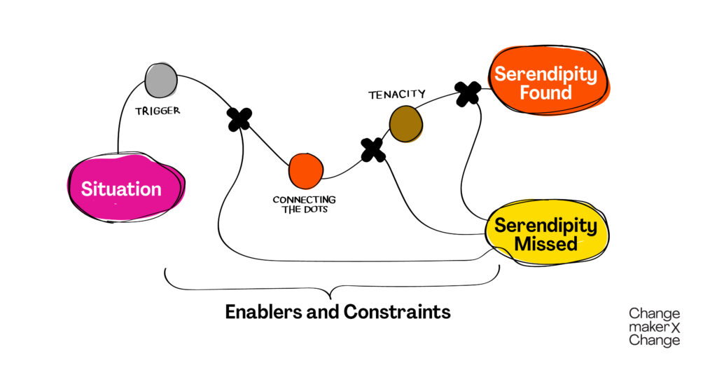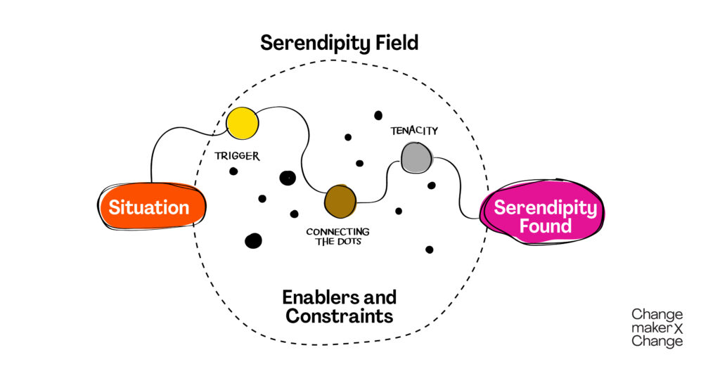 - What differentiates serendipity from blind luck is that instead of being a passive recipient of the unexpected situation, you link the trigger to something previously unrelated. This is where you connect the dots and realise the potential value of the unexpected situation.