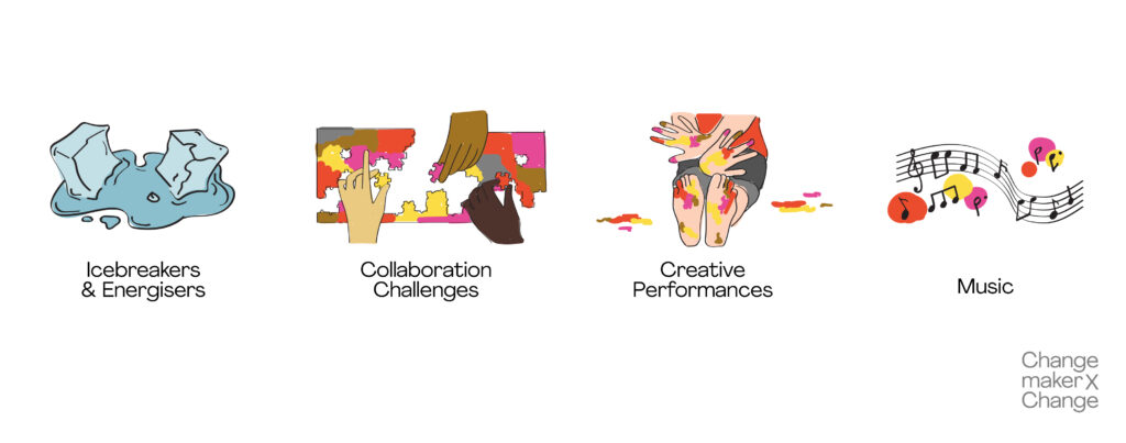 - Creative performances. From performances to harvest takeaways to co-created talent shows at the end of your event, tapping into the world of ‘performances’ is incredibly effective to cultivate fun and play.